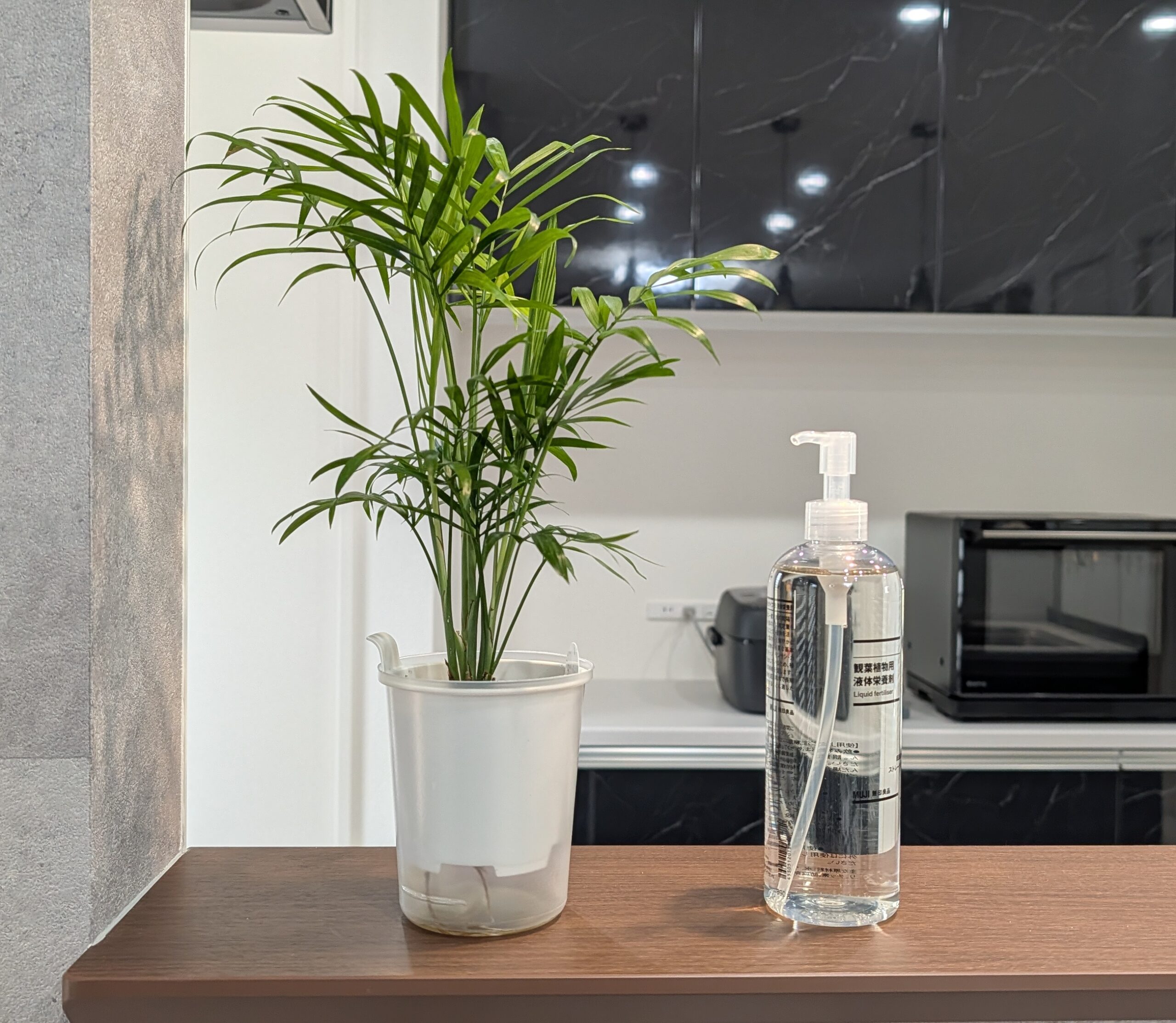 購入直後の鉢には水が入っていなかったため、家に持ち帰ってすぐに底面の給水鉢に水を入れ、そこへ液体栄養剤をワンプッシュ加えました。