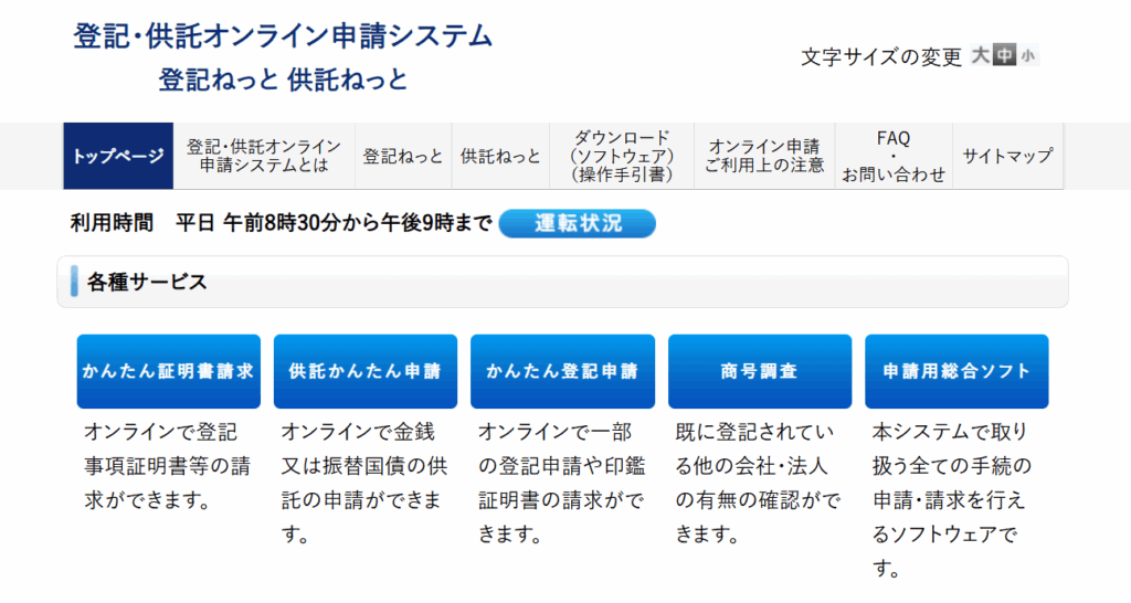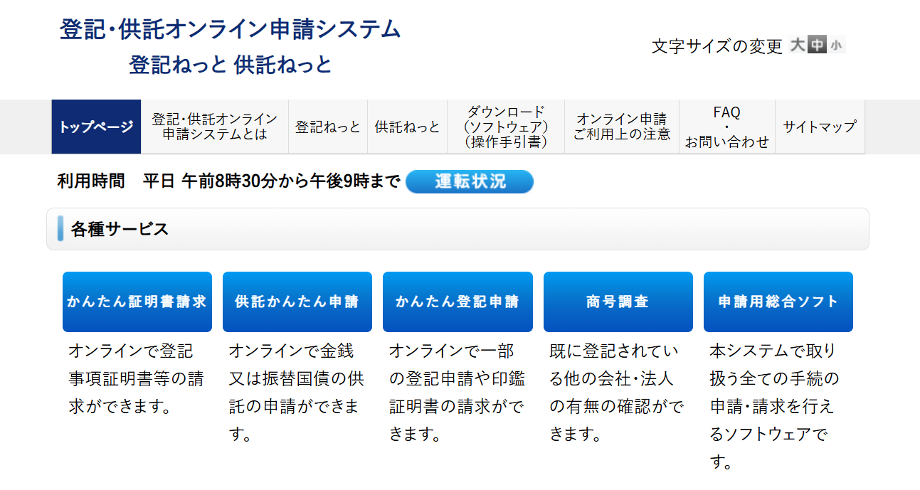 登記・供託オンライン申請システムのご利用時間は、月曜日から金曜日までの8時30分から21時まで。(国民の祝日・休日、12月29日から1月3日までの年末年始を除く。)
