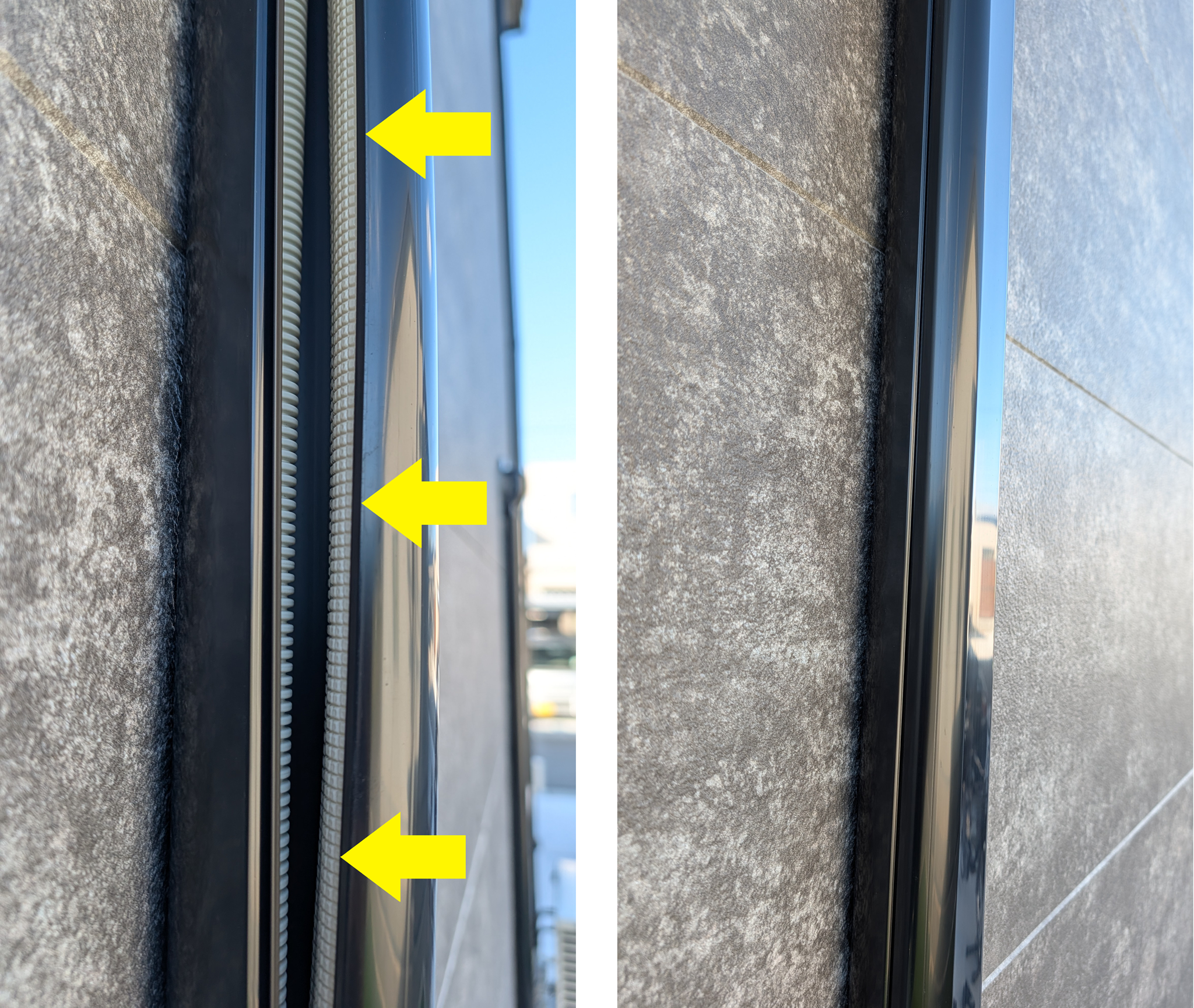 外に出て家の外観を眺めていると、エアコンの配管カバーが外れていました。ドレンホースが見える状態です。