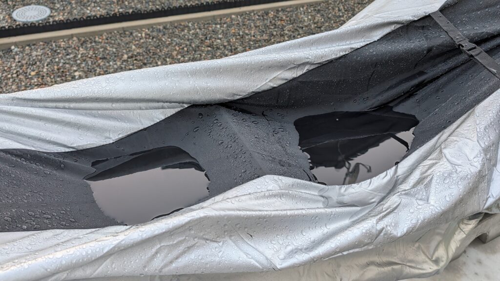 大雨でカバーに溜まった雨がおもりの役目をしていた可能性も考えられるので、強風の対策はもう少し検証が必要かもしれません。