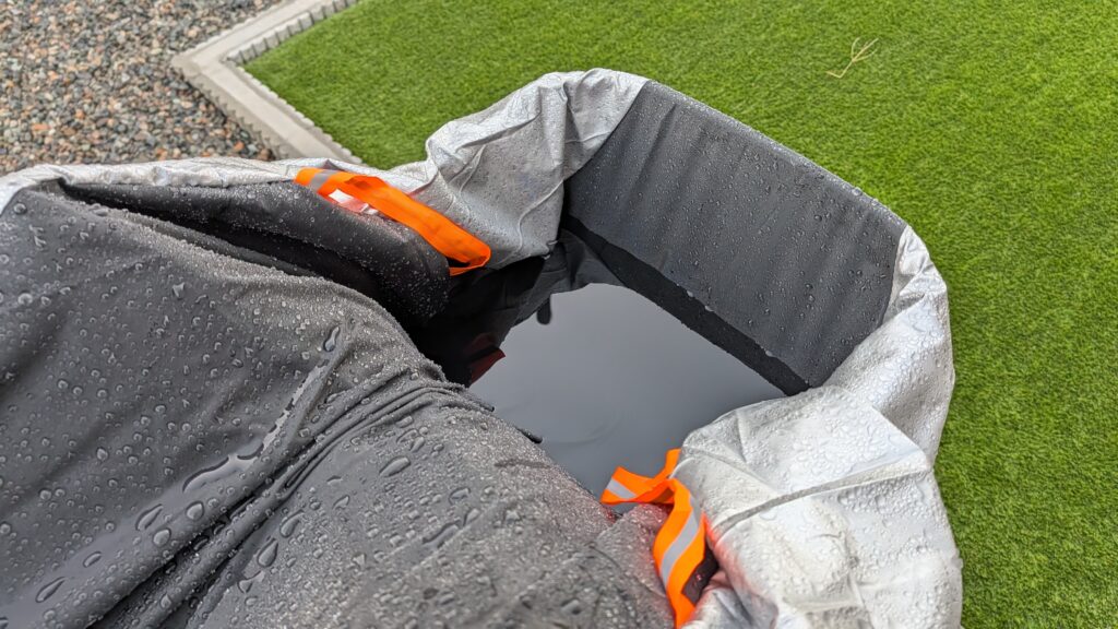 カバーには撥水加工がされているので雨から自転車を守ってくれますが、かごの部分に雨がたまりました。
