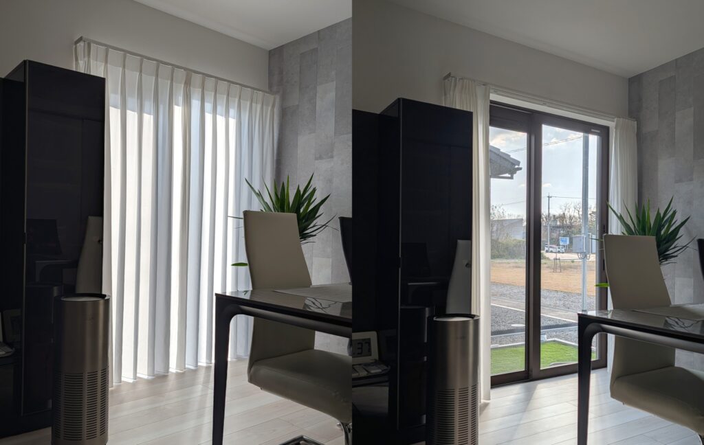 「ネフライト」のカーテンを開閉したときを比較。カーテンを開くと、強い光が直接入りますが、カーテンを閉じると光が拡散されて、優しい感じの光になります。