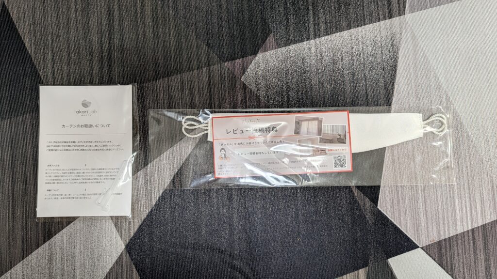 カーテンの取り扱い説明書と、レビュー投稿特典のタッセル 1セット(両開きの場合は2枚)