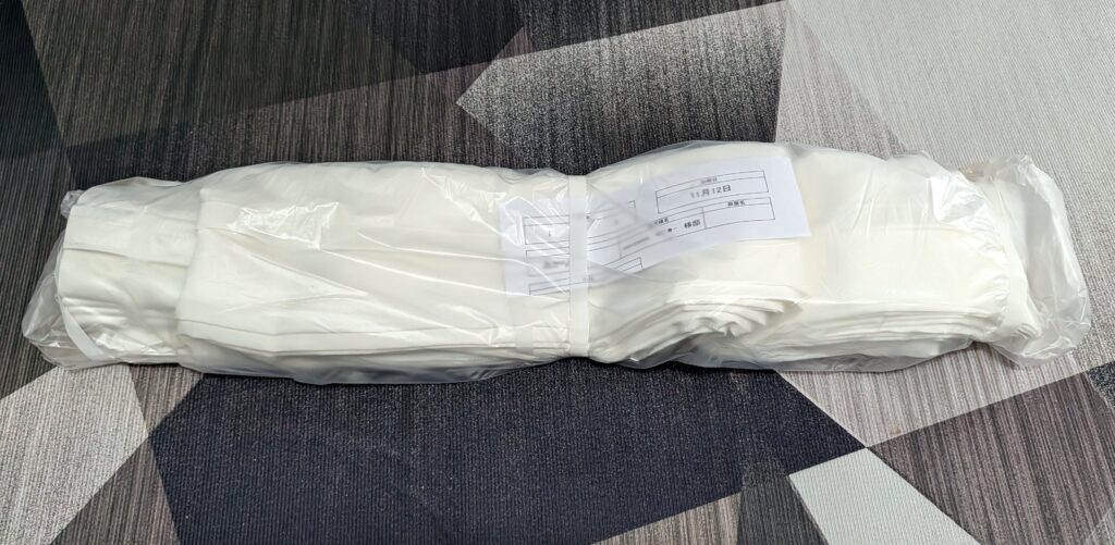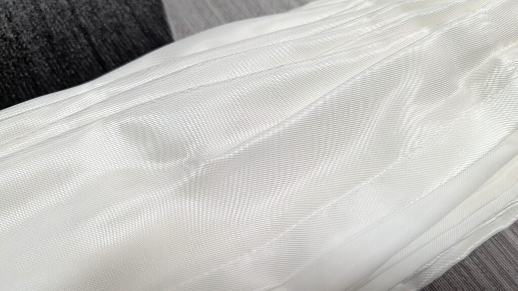 ひも状のウェイト(おもり)を縫い込む「チェーンウェイト加工」は有料オプションですが、美しいウェーブを表現できるようなので選択。カラーは無難な「白」にしました。