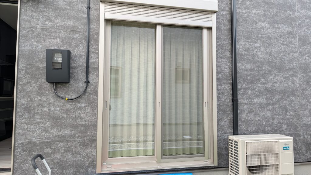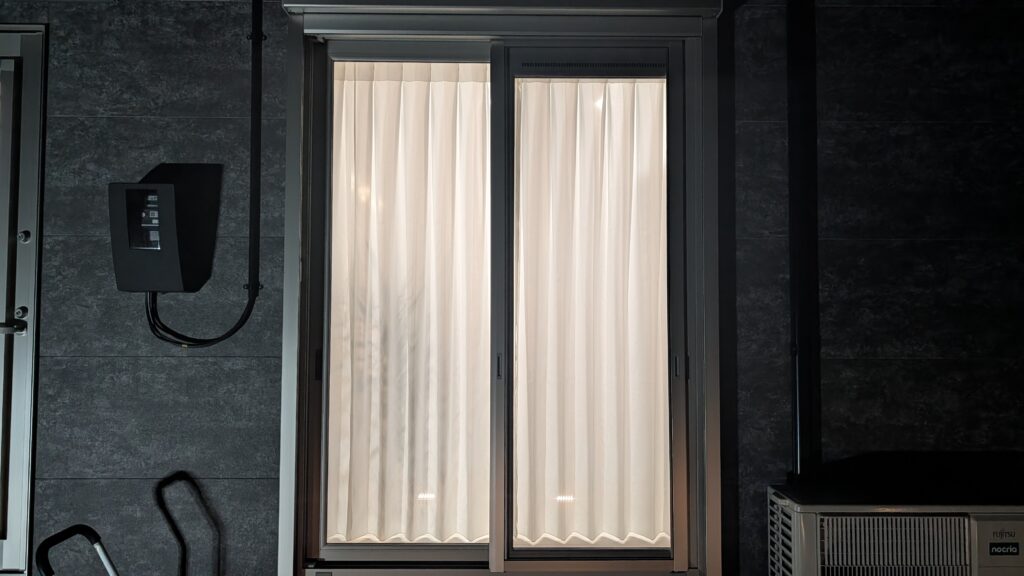 カーテンを取り付けた窓を外から撮影。昼はこのような感じで、中は全く見えません。
