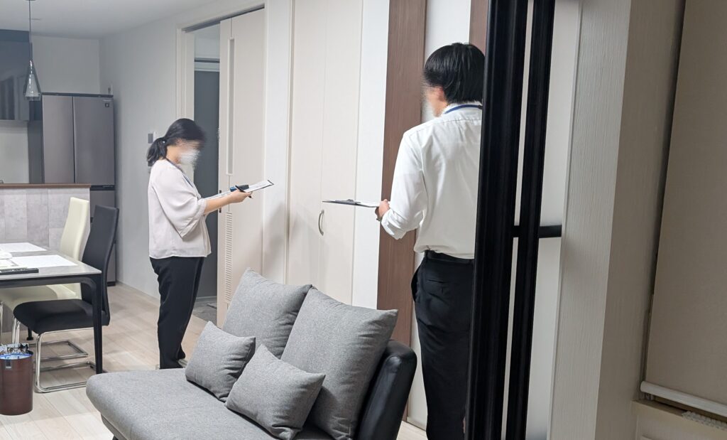 調査当日は、2名の担当者が現地調査を実施。1階の中を確認してから2階へ、最後は外観のチェックを行いました。特に困るような設備がないので、約20分くらいで完了しました。