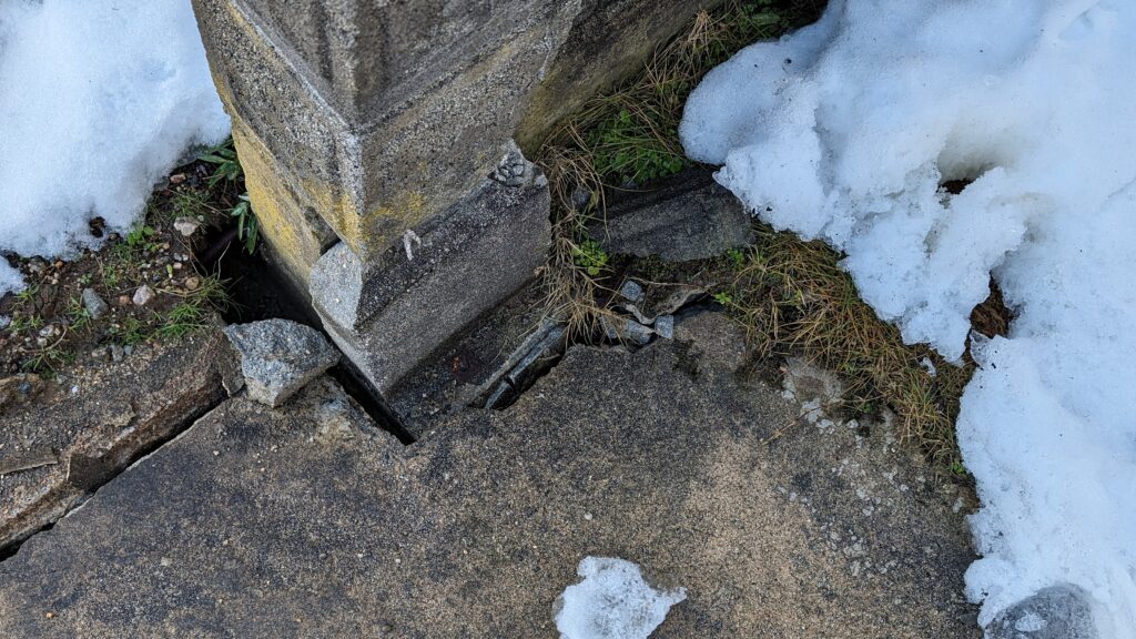 液状化で地面が20~30cmくらい移動したので、境界線のコンクリートブロックが10cm以上も離れました。